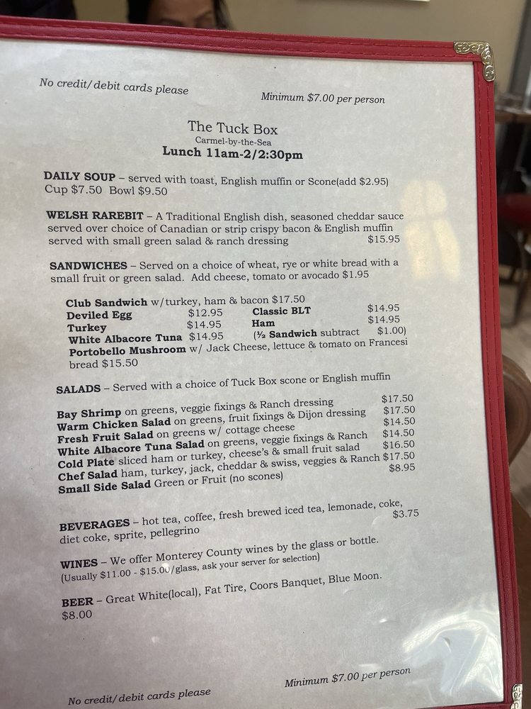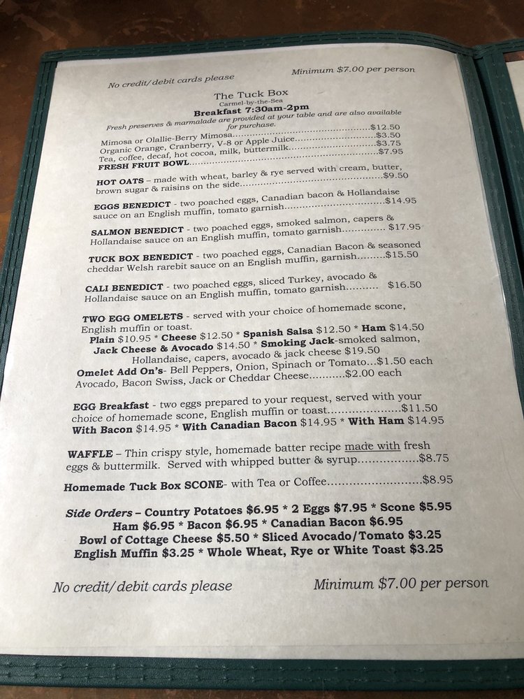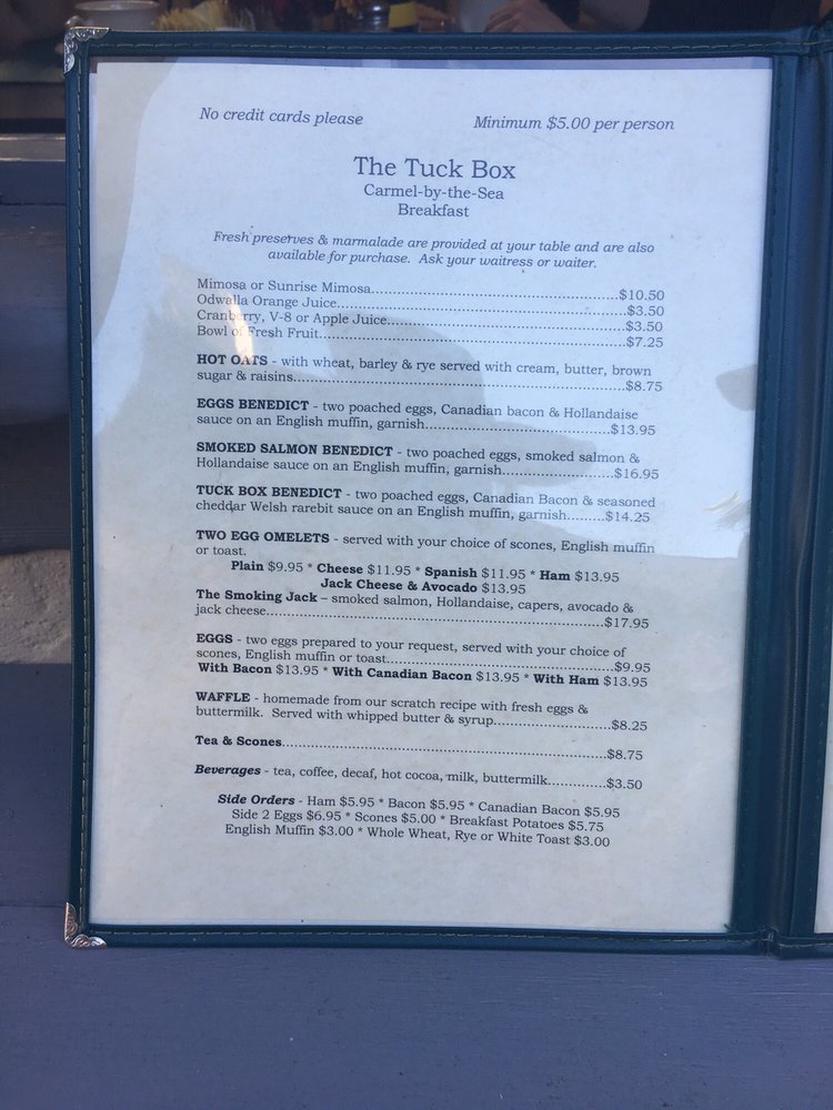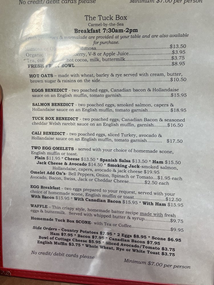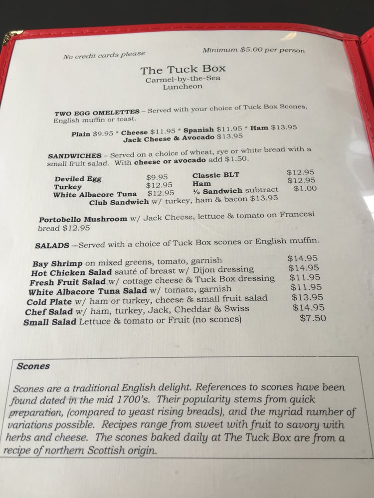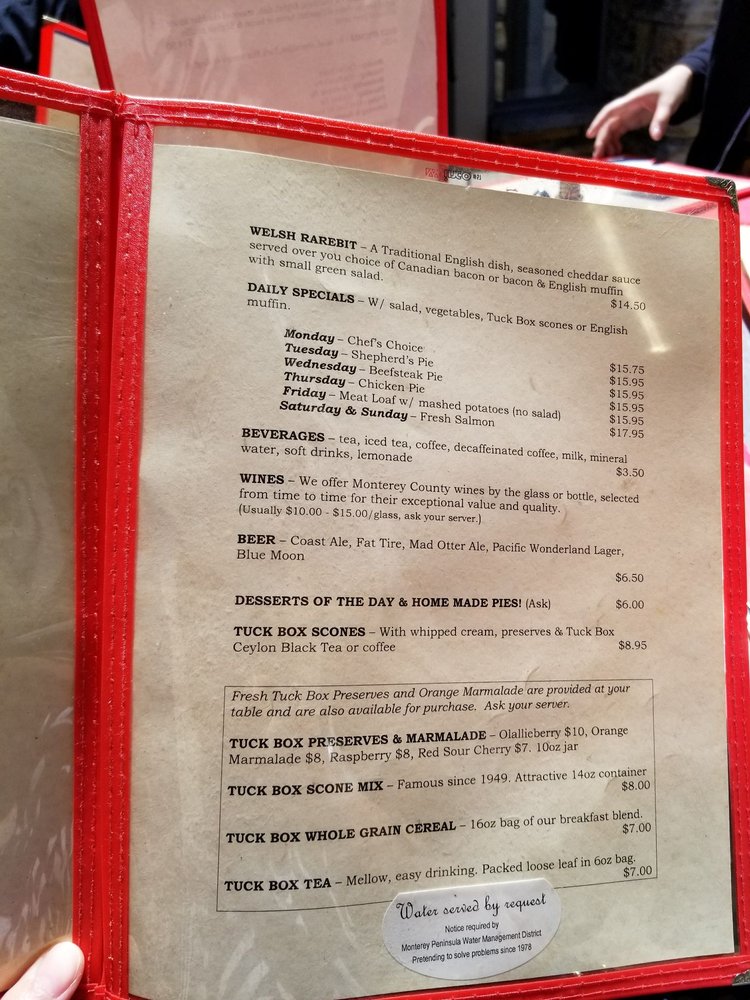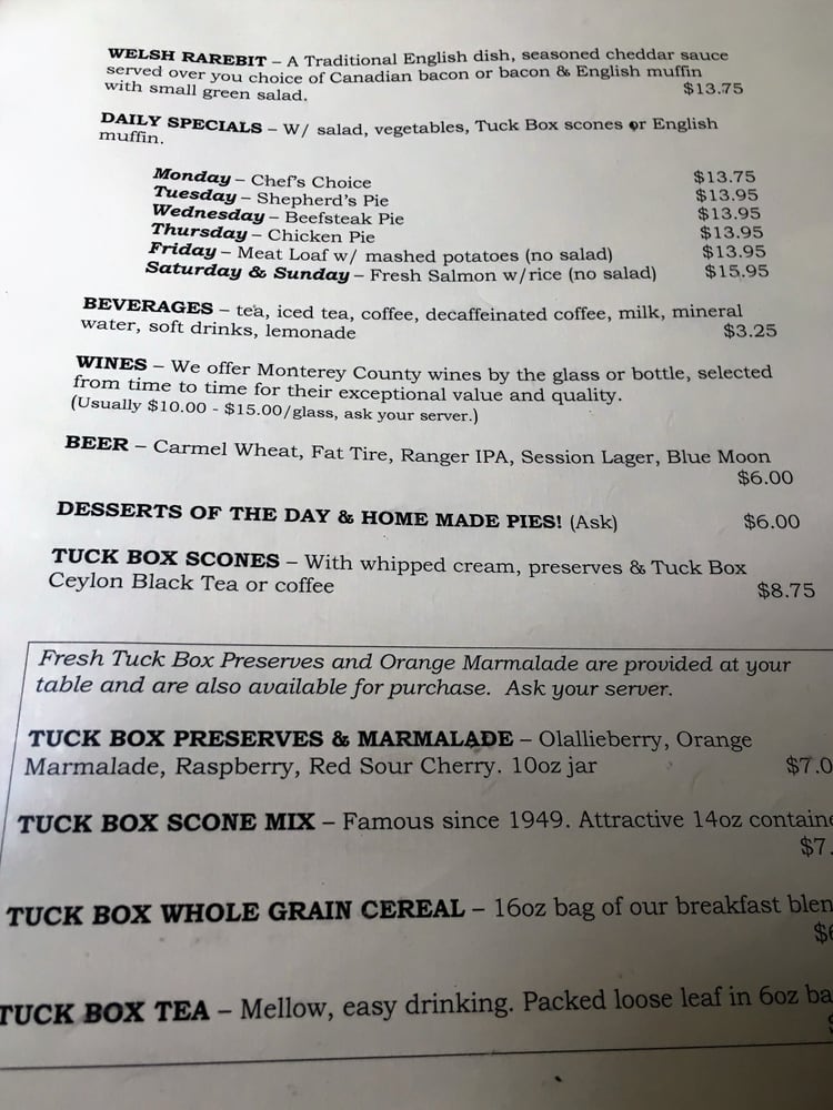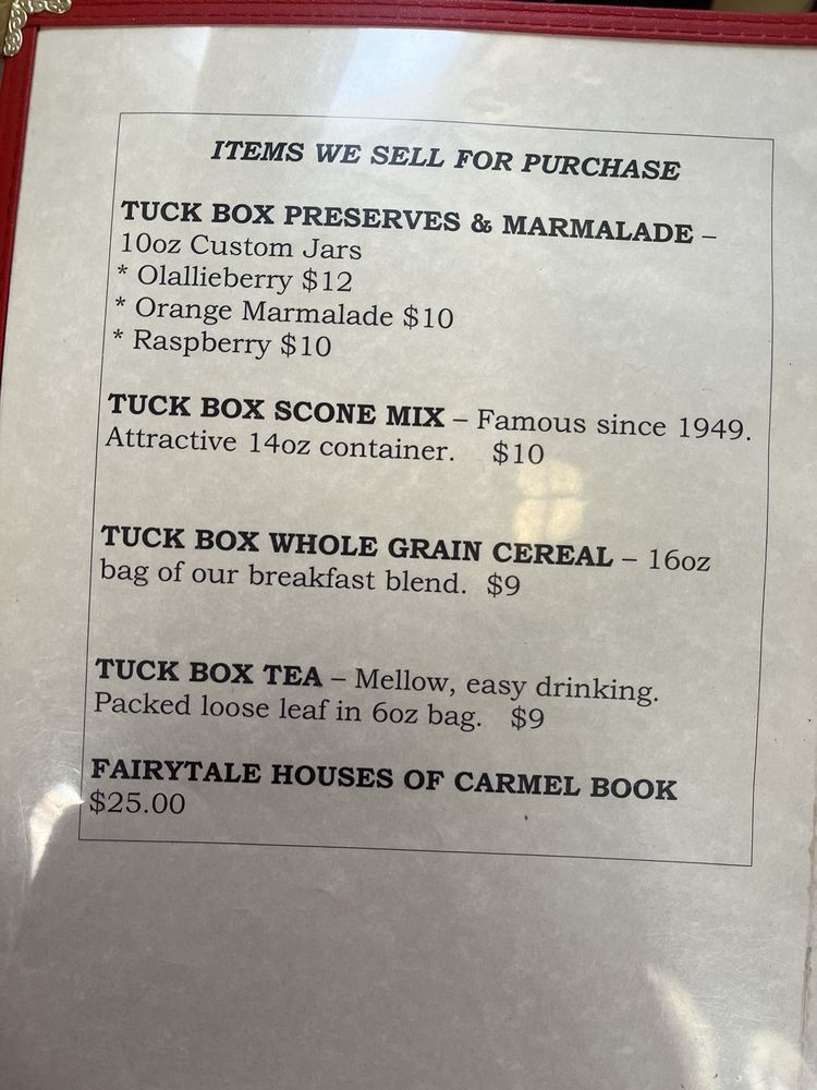 Located on Dolores St in Carmel, CA, The Tuck Box offers a cozy and magical dining experience. Customers rave about the charming cottage atmosphere adorned with teapots, fireplace, and window seating. The menu boasts tasty options like Eggs Benedict, Tuck Box Benedict, and delightful scones. The scones, made fresh and served with jams and whipped cream, are described as eggy and soft, unlike typical dry scones. Complement your meal with a refreshing ollala-berry mimosa or a well-balanced cup of coffee. The friendly staff adds to the welcoming ambiance, making it a memorable breakfast spot. Whether you're dining inside or outside on a beautiful day, The Tuck Box promises a delightful experience that will have you coming back for more.